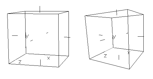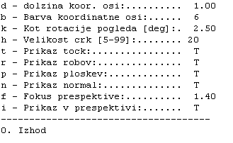 Spreminjamo lahko dolžino osi, barvo osi, kot, za katerega se bodo zavrteli modeli pri enem koraku interaktivnega vrtenja, velikost izpisa črk, vklapljamo lahko prikaz točk, robov ter ploskev, izris normal na ravnine. Nastavimo lahko faktor perspektivnega prikaza fo in preklapljamo med perspektivo in ortogonalno aksonometrično projekcijo. Oznaka 'T' oz. 'F' je kratica za angleški TRUE oz. FALSE.