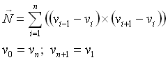 Dobimo vektor, ki je pravokoten na oba vektorja in s tem smernico normale. Prave usmerjenosti pa še vedno ne kaže, ker ne vemo, ali robova oklepata ostri ali topi kot ploskve. Zato je potrebno izračunati vektorski produkt v vsakem oglišču ploskve, dobljene vektorje pa med seboj sešteti,